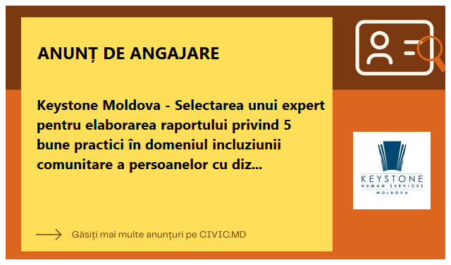 Keystone Moldova extinde concursul de selectare a unui expert pentru elaborarea unui raport național privind 5 bune practici în domeniul incluziunii comunitare a persoanelor cu dizabilități din Republica Moldova.