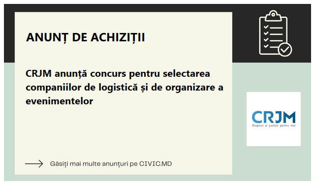Centrul de Resurse Juridice din Moldova (CRJM) lansează concurs pentru selectarea prestatorilo care să ofere servicii de organizare a evenimentelor pentru un termen de trei ani (decembrie 2025 – decembrie 2028).