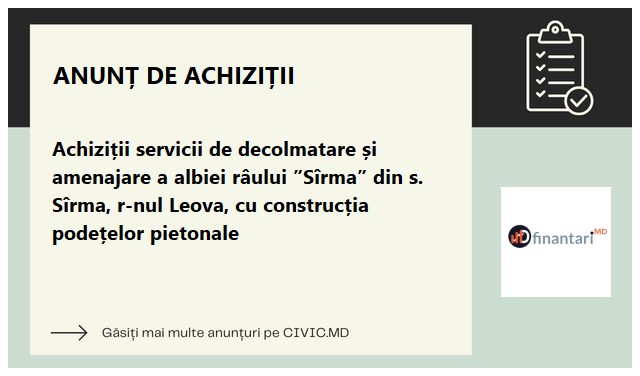 - Obiectul achiziției: ”Lucrări de decolmatare și amenajare a albiei râului ”Sîrma” din s. Sîrma, r-nul Leova”,