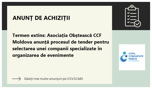 CCF Moldova anunță selectarea unei companii specializate în organizarea de evenimente care să poată oferi servicii integrate precum: închirierea sălilor de evenimente; cazare și alimentație pentru participanți; servicii de transport/rambursare cheltuieli transport.
