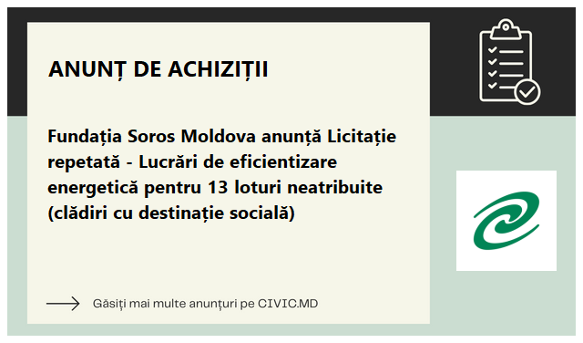 Fundația Soros Moldova anunță lansarea unei licitații repetate pentru identificarea unor companii calificate care să implementeze un pachet complex de măsuri de eficiență energetică în 13 clădiri destinate prestării de servicii sociale din Republica Moldova. Intervențiile sunt planificate în abordarea design-build (proiectare și construcție), fiind astfel vizate companii capabile să asigure un management integral al procesului — de la etapa de proiectare până la execuția lucrărilor — pentru modernizarea și creșterea sustenabilității infrastructurii sociale.
