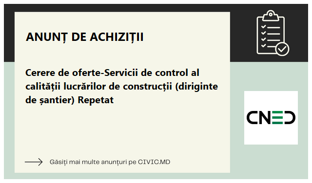 Instituția Publică Centrul Național pentru Energie Durabilă (IP CNED) anunță lansarea repetată a procedurii de achiziție a serviciilor de control al calității lucrărilor de reabilitare energetică a caselor individuale cu vulnerabilitate energetică extremă din Republica Moldova (diriginte de șantier) în cadrul Produsului de finanțare „Eficiența energetică a caselor individuale din gospodării rurale cu grad de vulnerabilitate energetică extremă”, tranșa a 2-a.