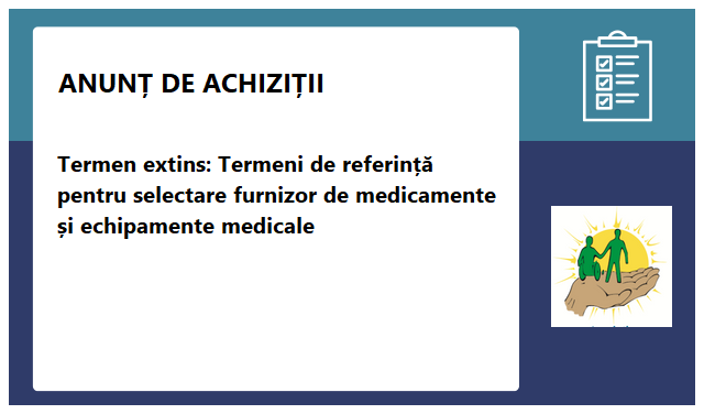 Asociația „MOTIVAȚIE” din Moldova, în cadrul proiectelor pe care le implementează, derulează activități de asistență umanitară sub formă de medicamente și echipamente medicale pentru refugiați și persoane cu dizabilități. Pentru implementarea adecvată a activităților, Asociația inițiază procedura de selectare a unui furnizor care să poată asigura furnizarea medicamentelor și echipamentelor medicale necesare.