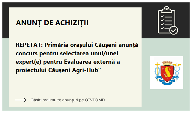 Repetat: Primăria orașului Căușeni anunță concurs pentru selectarea unui/unei expert(e) pentru Evaluarea externă a proiectului "Căușeni Agri-Hub”