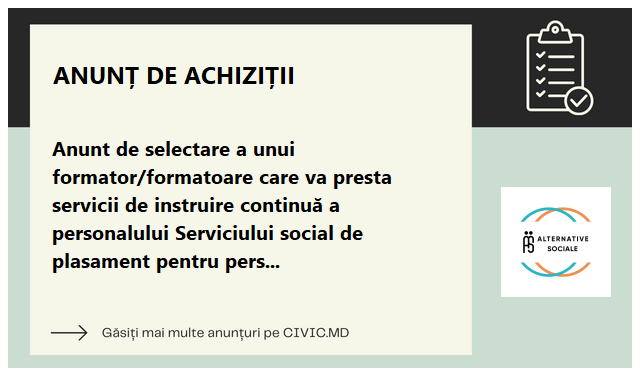 Anunt de selectare a unui formator/formatoare care va presta servicii de instruire continuă a personalului Serviciului social de plasament pentru persoane adulte și cu dizabilități