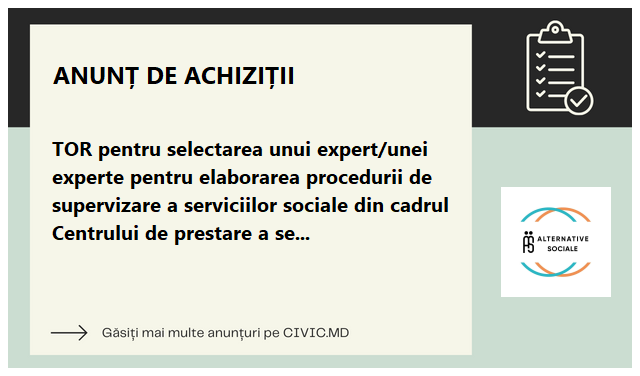 În acest context, AO „Alternative sociale” intenționează să contracteze un expert/o expertă care să elaboreze Procedura de supervizare a Serviciului social Centru de prestare a serviciilor sociale nr.1, ca mecanism de sprijin, orientare profesională și control al calității intervențiilor.