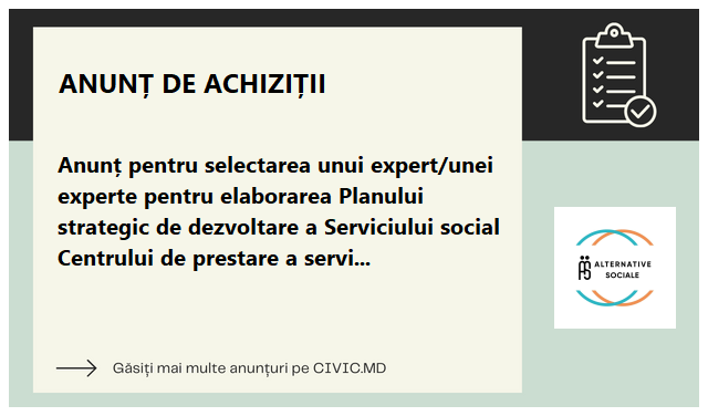 Anunț pentru selectarea unui expert/unei experte pentru elaborarea Planului strategic de dezvoltare a Serviciului social Centrului de prestare a serviciilor sociale nr.1