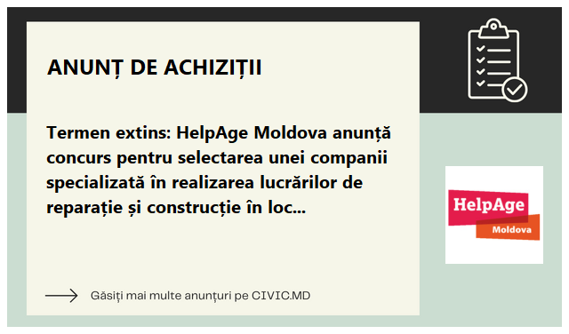 La moment, HelpAge este în căutarea unei companii specializată în realizarea lucrărilor de reparație și construcție în cadrul Clubului pentru persoane vârstnice din localitatea Prepelița, raionul Sîngerei.