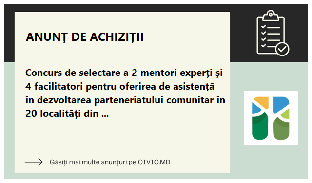 Concurs de selectare a 2 mentori experți și 4 facilitatori pentru oferirea de asistență în dezvoltarea parteneriatului comunitar în 20 localități din Republica Moldova, în cadrul Programului de capacitare și asistență „Next Level” ediția a III-a