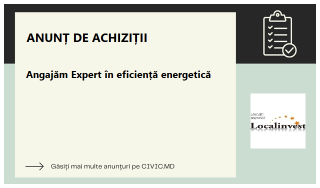 Asociația Obștească „Localinvest” caută un expert calificat în domeniul eficienței energetice pentru desfășurarea două semenarelor, care va fi organizate în cadrul proiectul "Energie verde pentru servicii sociale mai bune", implementat din resursele Uniunii Europene, prin proiectul „Parteneriate locale pentru eficiența energetică în servicii sociale”, cofinanțat și implementat de Fundația Soros Moldova, în parteneriat cu IP Keystone Moldova și AO „Fondul de Inovații Sociale din Moldova”.