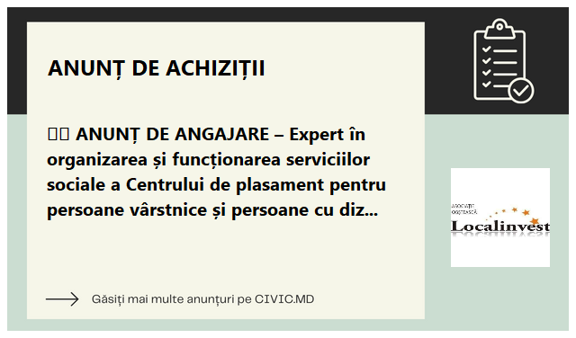 Expert în organizarea și funcționarea serviciilor sociale a Centrului de plasament pentru persoane vârstnice și persoane cu dizabilități or. Rîșcani, în vederea asigurării prestării calitative a serviciilor pentru persoanele vârstnic