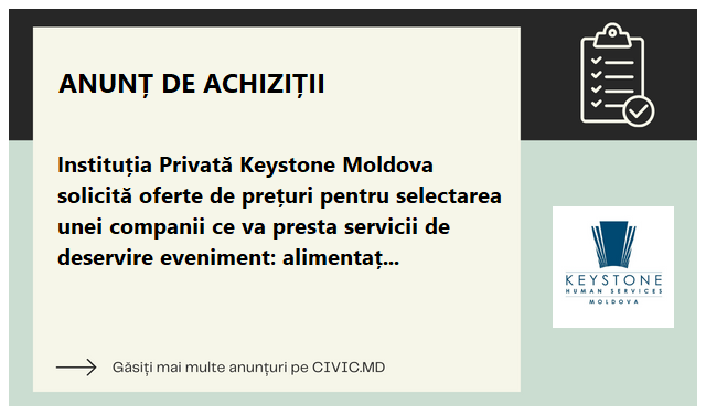 Instituția Privată Keystone Moldova solicită oferte de prețuri pentru selectarea unei companii ce va presta servicii de deservire eveniment: alimentație participanți și locație eveniment (chirie sală)
