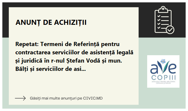 Repetat: Termeni de Referință pentru contractarea serviciilor de asistență legală și juridică în r-nul Ștefan Vodă și mun. Bălți și serviciilor de asistență psihologică în r-nele Cahul și Ștefan Vodă și mun. Bălți