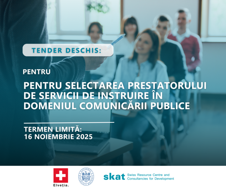 Fundația Centrul Moldo-Elvețian pentru Cooperare SKAT, ce implementează Proiectul „MĂ IMPLIC” – Faza a II-a (noiembrie 2023 – octombrie 2027), anunță lansarea unei proceduri de tender deschis pentru selectarea unei companii specializate în prestarea serviciilor de instruire în domeniul comunicării.