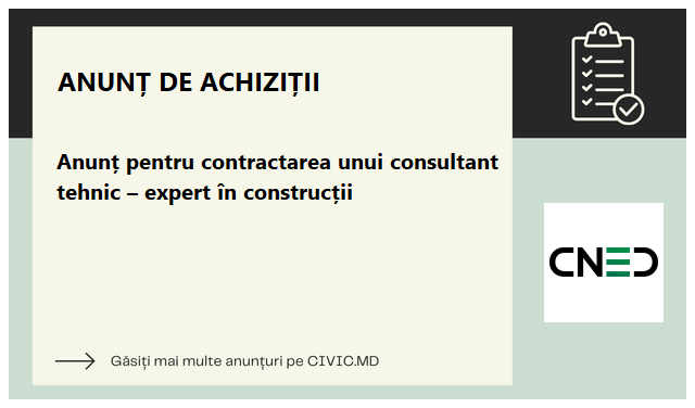 Instituția Publică Centrul Național pentru Energie Durabilă (în continuare IP CNED), anunță desfășurarea unui concurs pentru contractarea unui consultant tehnic – expert în construcții (în continuare, Consultant).