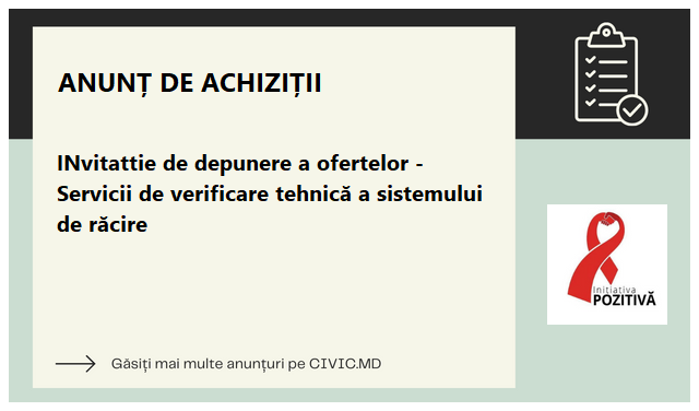 Asociaţia Obştească „Iniţiativa Pozitivă” vă invită să prezentați oferta Dvs. de preț pentru procurarea serviciilor specificate în Anexa nr.1 - Servicii de verificare tehnică a sistemului de răcire.