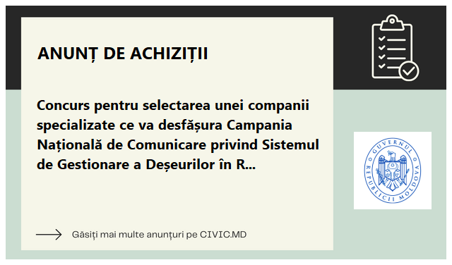 Concurs pentru selectarea unei companii specializate ce va desfășura Campania Națională de Comunicare privind Sistemul de Gestionare a Deșeurilor în Republica Moldova