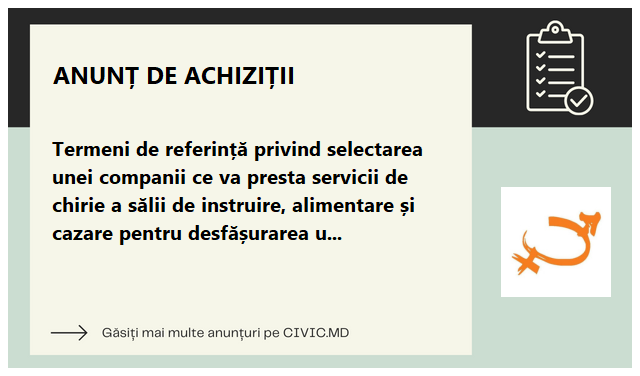 Obiectivul concursului: Selectarea unei companii/organizații care va oferi servicii de chirie a sălii pentru o instruire, de 3 zile (cel puțin 8 ore primele 2 zile și 4 ore a treia zi), cu capacitatea sălii de până la 40-45 de persoane, servicii de alimentație publică ce includ apă, pauze de cafea, prânz, cină, mic dejun și servicii de cazare pentru circa 20-30 de participanți și participante.