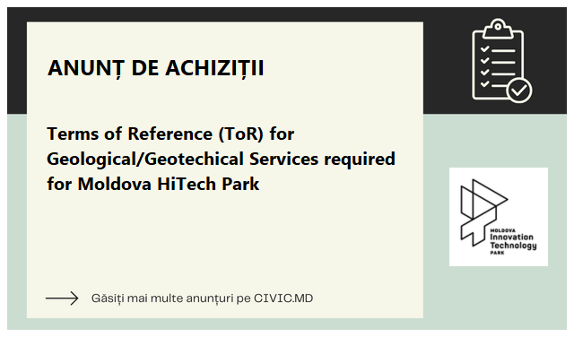 The Moldova Innovation Technology Park (MITP) is looking for a geological/geotechnical company which will provide Geological/Geotechnical Services required for Moldova HiTech Park (MHTP). MHTP is envisioned as a hub for innovation, technology, and education focusing on sectors like artificial intelligence, cybersecurity, and big data Moldovan legislation mandates that prior to design and construction, comprehensive engineering-geological investigations be performed as part of the project’s technical documentation.