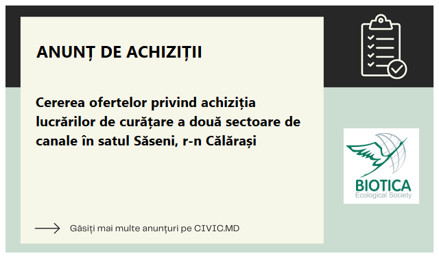 A.O. Societatea Ecologică „BIOTICA” în parteneriat cu Primăria Săseni anunță lansarea procedurii de selectare a ofertanților pentru executarea lucrărilor de curățare, decolmatare și amenajare a două sectoare de canale de evacuare a apelor pluviale în satul Săseni, r-n Călărași, conform informației tehnice.