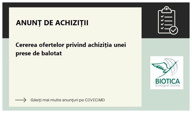 A.O. Societatea Ecologică „BIOTICA” în parteneriat cu Primăria Săseni anunță lansarea concursului pentru selectarea entităților specializate în furnizarea și livrarea unei prese de balotat electro-hidraulice tip HSM V-Press 840 sau a unui echipament analogic cu parametri tehnici echivalenți.