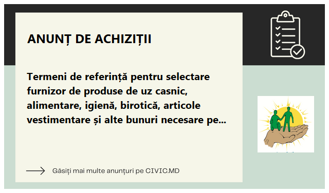 Termeni de referință pentru selectare furnizor de produse de uz casnic, alimentare, igienă, birotică, articole vestimentare și alte bunuri necesare pentru proiecte de suport umanitar
