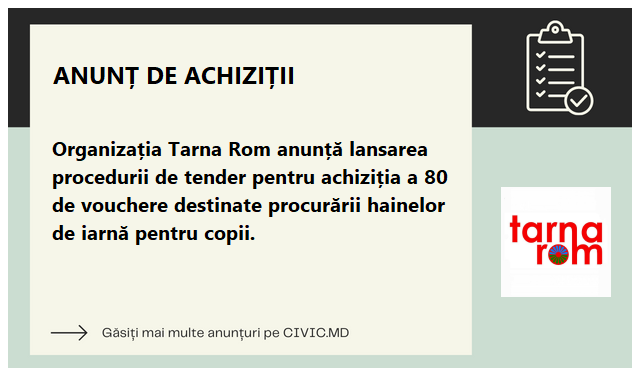 Organizația Tarna Rom anunță lansarea procedurii de tender pentru achiziția a 80 de vouchere destinate procurării hainelor de iarnă pentru copii.