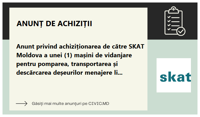 Anunt privind achiziționarea de către SKAT Moldova a unei (1) mașini de vidanjare pentru pomparea, transportarea și descărcarea deșeurilor menajere lichide