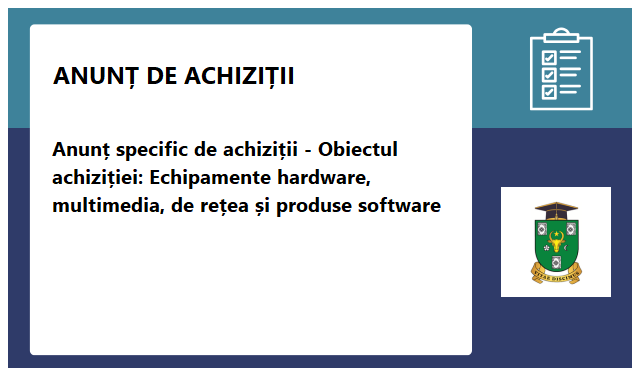 Anunț specific de achiziții - Obiectul achiziției: Echipamente hardware, multimedia, de rețea și produse software