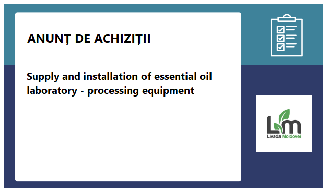 2. The implementing agency/Purchaser - Consolidated Unit for Implementing and Monitoring the Wine Sector Restructuring Program (UCIMPRSVV) now invites sealed Bids from eligible Bidders for Supply and installation of essential oil laboratory-processing equipment. Supply period is up to 90 working days from contract award date. The Bidder must bid for 100% of requested items and adjacent services.