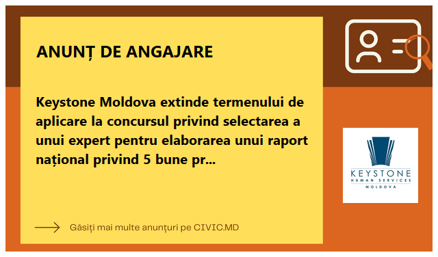 Keystone Moldova anunță extinderea termenului de aplicare la concursul pentru selectarea unui expert care va documenta și analiza 5 modele de bune practici din Republica Moldova, în conformitate cu metodologia comună a proiectului „Comunități Incluzive Transfrontaliere”, co-finanțat de Uniunea Europeană prin programul Interreg NEXT România – Republica Moldova, și are ca scop îmbunătățirea serviciilor sociale și medicale pentru persoanele cu dizabilități intelectuale și probleme de sănătate mintală.