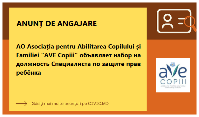 AO Asociația pentru Abilitarea Copilului și Familiei ”AVE Copiii” объявляет набор на должность Специалиста по защите прав ребёнка