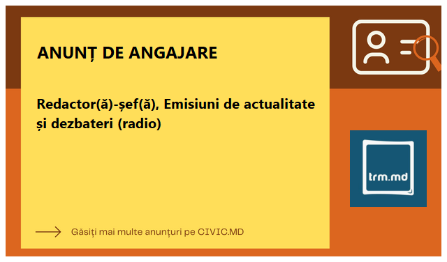 IP Compania „Teleradio-Moldova” este în căutarea unei persoane pentru ocuparea funcției de Redactor(ă)-șef(ă), Emisiuni de actualitate și dezbateri (radio).