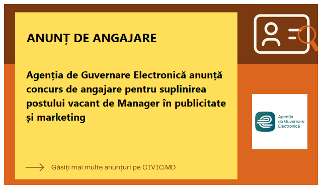 Instituția publică „Agenția de Guvernare Electronică” anunță concurs de angajare pentru suplinirea postului vacant de Manager în publicitate și marketing (produs, strategii si adopție, conținut și platforme) în cadrul Direcția adopție și incluziune, marketing și comunicare.
