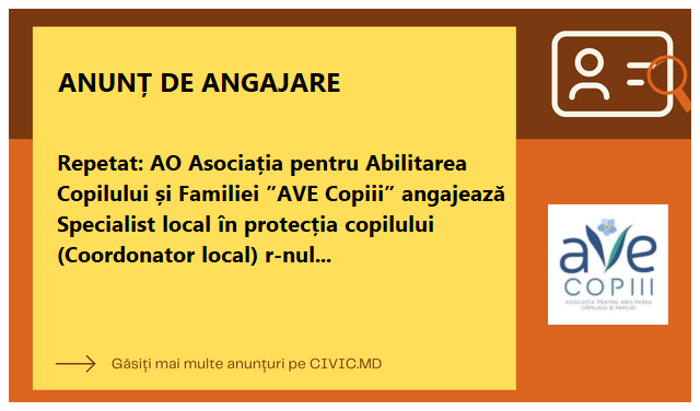 Repetat: AO Asociația pentru Abilitarea Copilului și Familiei ”AVE Copiii” angajează Specialist local în protecția copilului (Coordonator local) r-nul Cimișlia