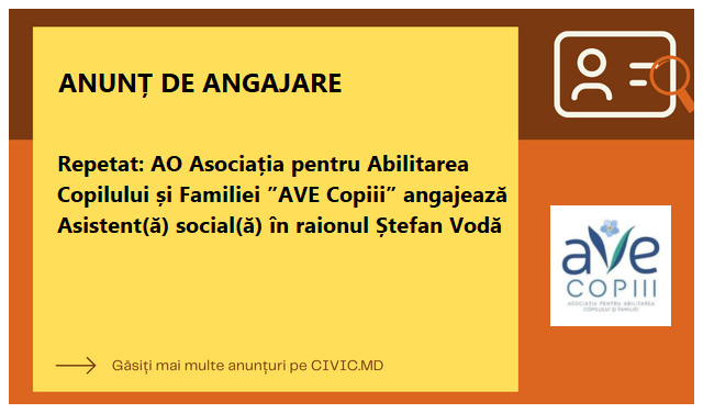Repetat: AO Asociația pentru Abilitarea Copilului și Familiei ”AVE Copiii” angajează Asistent(ă) social(ă) în raionul Ștefan Vodă