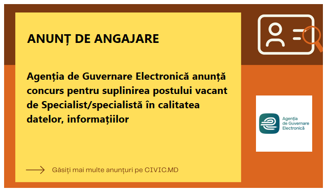 Agenția de Guvernare Electronică anunță concurs pentru suplinirea postului vacant de Specialist/specialistă în calitatea datelor, informațiilor
