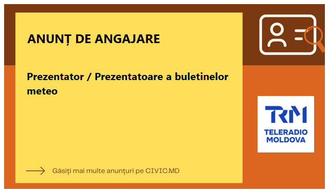 Acum ai posibilitatea să devii vocea și chipul care aduce zilnic vremea în casele telespectatorilor. Citește cerințele funcției și dacă ți se potrivește, atunci te așteptăm în echipa noastră.