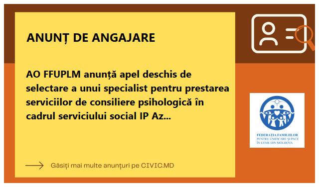 AO FFUPLM anunță apel deschis de selectare a unui specialist pentru prestarea serviciilor de consiliere psihologică în cadrul serviciului social IP Azilul pentru persoane cu dizabilități și etate din or. Leova