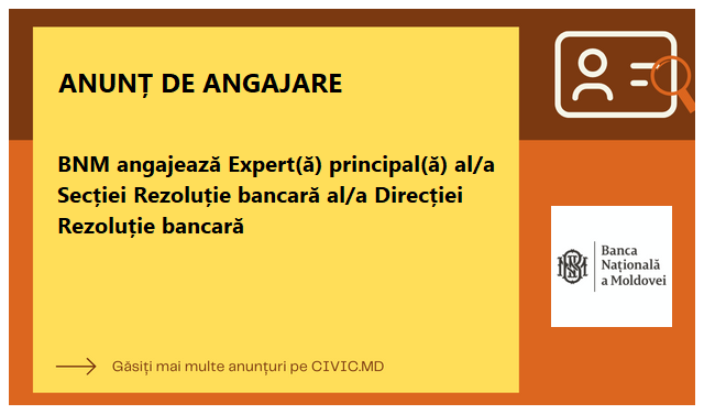 BNM angajează Expert(ă) principal(ă) al/a Secției Rezoluție bancară al/a Direcției Rezoluție bancară
