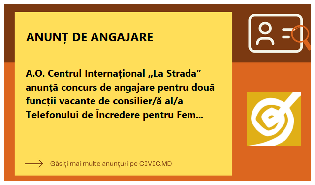 A.O. Centrul Internațional ,,La Strada” anunță concurs de angajare pentru două funcții vacante de consilier/ă al/a Telefonului de Încredere pentru Femei și Fete
