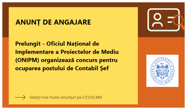 Oficiul Național de Implementare a Proiectelor de Mediu (ONIPM) organizează concurs pentru ocuparea postului de Contabil Șef, în cadrul compartimentului financiar-contabil.