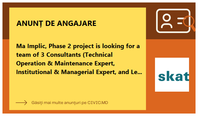 "Ma Implic, Phase 2" project is looking for a team of 3 Consultants (Technical Operation & Maintenance Expert, Institutional & Managerial Expert, and Legal Expert)