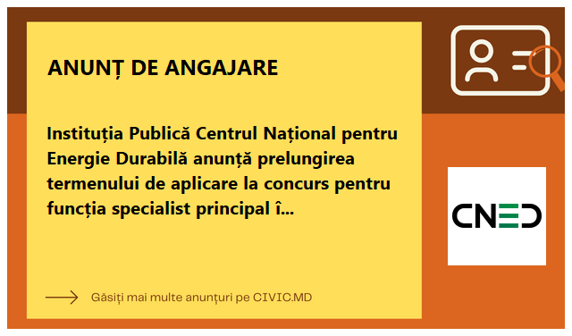 - Instituția Publică Centrul Național pentru Energie Durabilă anunță concurs pentru ocuparea funcției vacante de specialist principal al secției Fondul pentru Eficiență Energetică în sectorul Rezidențial din Moldova (FEERM)