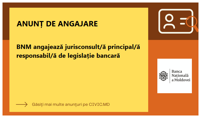 BNM angajează jurisconsult/ă principal/ă responsabil/ă de legislație bancară