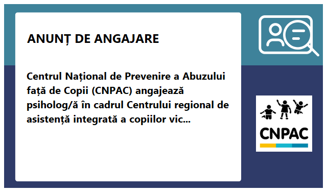 Centrul Național de Prevenire a Abuzului față de Copii (CNPAC) angajează psiholog/ă în cadrul Centrului regional de asistență integrată a copiilor victime/martori ai infracțiunilor din zona de Nord