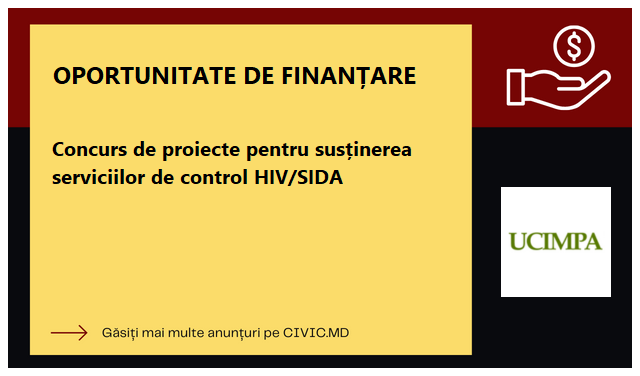 Instituția Publică „Unitatea de Coordonare, Implementare și Monitorizare a Proiectelor în Domeniul Sănătății” (IP UCIMP DS), Recipientul Principal (RP) al Grantului Fondului Global pentru Lupta Împotriva SIDA, Tuberculozei și Malariei (FG) – anunță Concurs de proiecte pentru finanțarea serviciilor de prevenire HIV/HV/ITS și aderență la tratament în rândul grupurilor cheie afectate (GCA) și persoanele care trăiesc cu HIV.