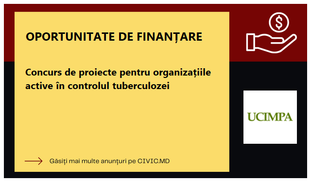 Instituția Publica Unitatea de Coordonare, Implementare si Monitorizare a proiectelor în domeniul sănătății (IP UCIMP DS), Recipientul Principal al Grantului Fondului Global de Combatere a SIDA, Tuberculozei și Malariei (FG) – anunță Concurs de proiecte pentru finanțarea activităților de screening a tuberculozei și de realizare a activităților de informare, educare și suport psiho-social pentru creșterea aderenței la tratamentul antituberculos și a altor activități în susținerea răspunsului național în controlul TB în grupurile cu risc sporit, prin intermediul organizațiilor neguvernamentale.