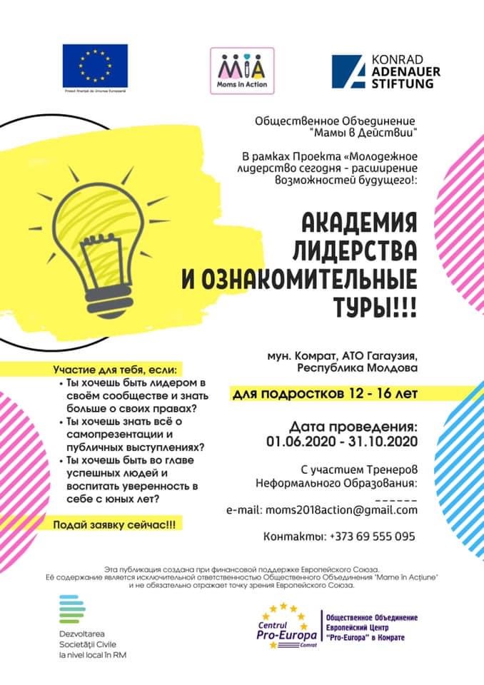 Проект "Молодежное лидерство сегодня - расширение возможностей будущего!" имплементируется при финансовой поддержке European Union in the Republic of Moldova и Fundatia Konrad Adenauer Republica Moldova в рамках Проекта "Развитие гражданского общества местного уровня в Республике Молдова" Dezvoltarea societății civile la nivel local în Republica Moldova Региональным партнером выступает Pro-Europa Comrat.
