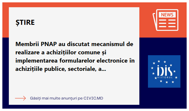 Membrii Platformei Naționale pentru Achiziții Comune s-au întrunit în ședință luni, 20 octombrie, 2025. În cadrul ședinței, Ministerul Finanțelor a prezentat Hotărârea Guvernului privind aprobarea formularelor standard pentru publicarea anunțurilor în domeniul achizițiilor publice, sectoriale, al apărării și securității, precum și al concesiunilor, iar experții IDIS „Viitorul” – o analiză a mecanismului privind realizarea unei achiziții comune și factorii care îngreunează asocierea. Evenimentul a avut loc în parteneriat cu Ministerul Finanțelor, în cadrul proiectului „Sprijinirea reformei achizițiilor publice din Moldova în contextul aderării la UE”, implementat de către IDIS „Viitorul”, cu suportul Uniunii Europene, în perioada septembrie 2025 – septembrie 2026.